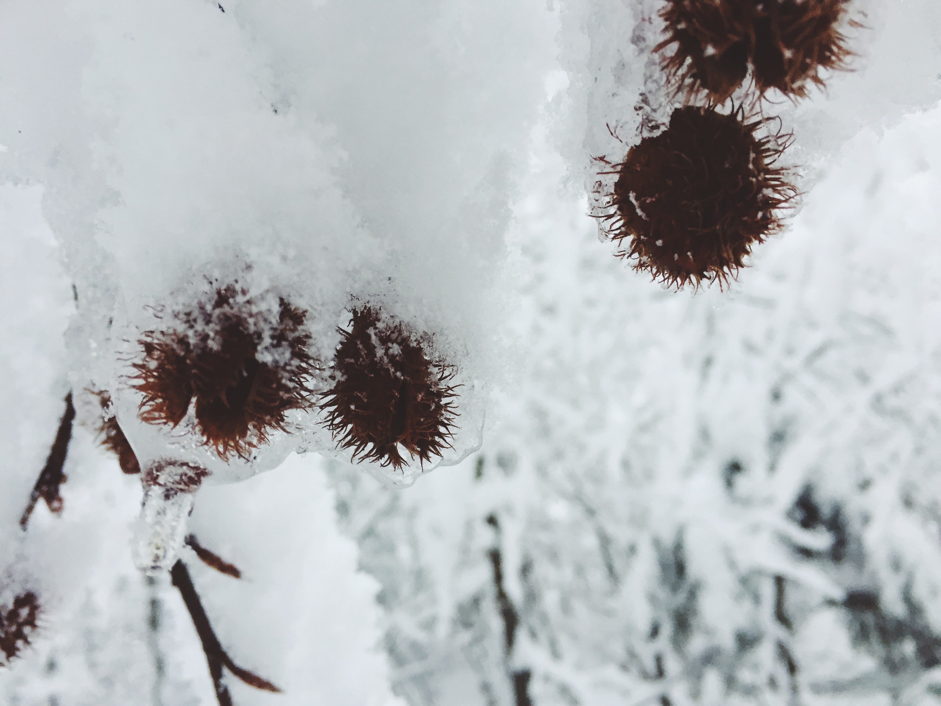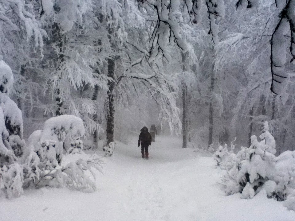 Le repas terminé, il était l’heure de se remettre en route pour atteindre notre destination finale de la journée, le refuge des Champis, à quelques kilomètres de là. La neige n’ayant pas cessé de tomber, nous nous engageâmes alors dans un itinéraire féérique où les arbres revêtaient d’éphémères parures blanches et cristallines. Notre périple, après nous avoir fait quitter dans la matinée le brun de la boue, nous emportait maintenant dans un lieu où le ciel et la terre semblait se rejoindre dans une union parfaite avec pour unique lien les bras tortueux des arbres. Émerveillés et joyeux, les boules de neige fusèrent pour faire dégringoler l’épaisse couche de neige qui surplombait l’un ou l’autre, tandis que l’équipe se faufilait dans ce sentier forestier.
