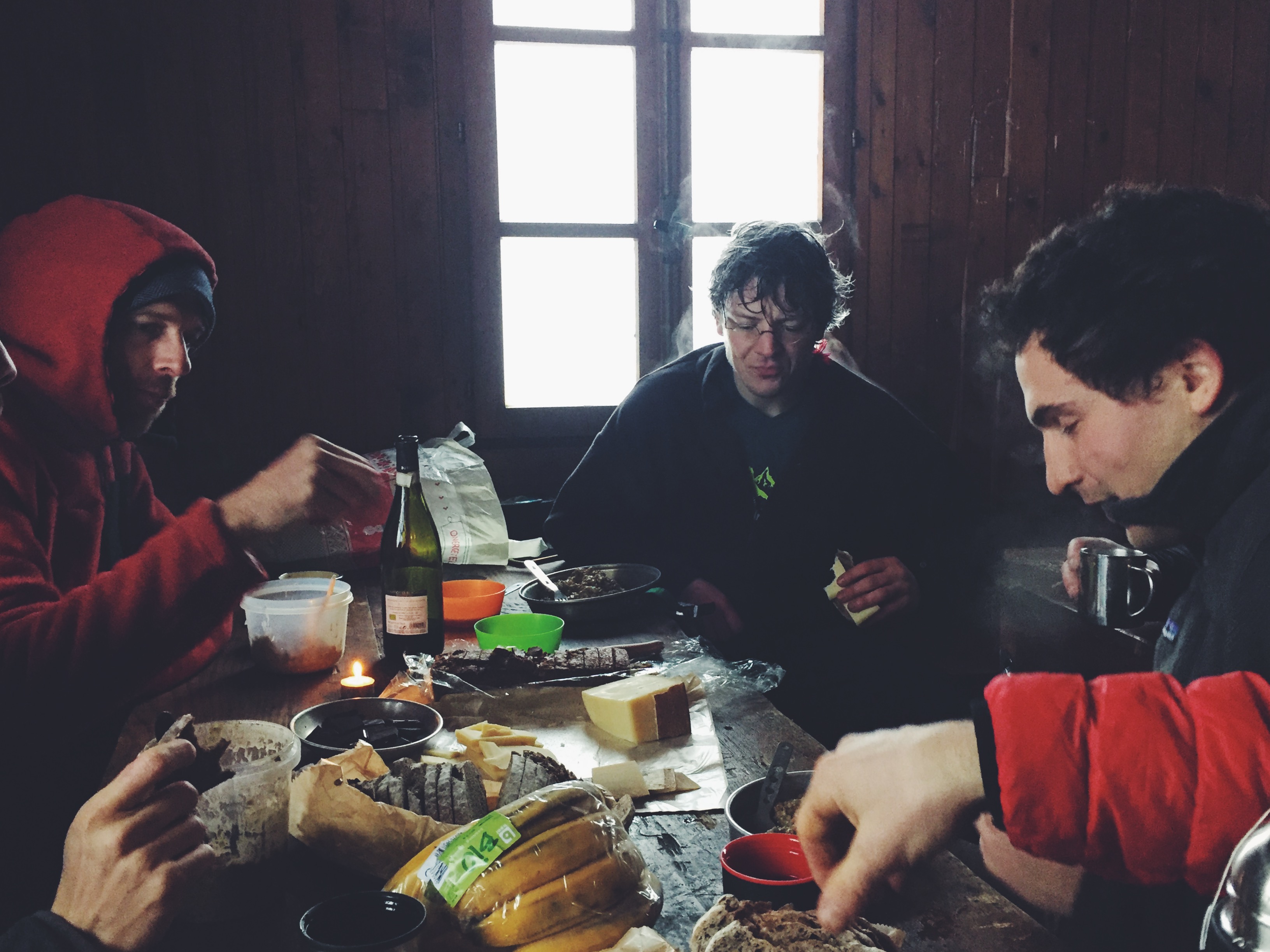 Tout à coup, l’orée de la forêt nous apparut, nous abandonnant à un désert blanc et déroutant. Comme hors du temps, nous nous dirigions aveugles vers le chalet qui quelque pas plus loin se dessinera à l’orée d’un autre bois. L’endroit charmant avait attiré de nombreux randonneurs et lorsque nous ouvrîmes la porte, une dizaine d’entre eux étaient affairés à faire sécher leur vêtements, à cuisiner et a attiser le feu qui se consumait dans la cheminée centrale. La pénombre de la fin du jour était transpercée de l’éclat des flammes et des lampes frontales dont la lueur dansait sur les murs en pierres et le plafond en bois. Une épaisse buée recouvrait les fenêtres et un mélange de feu de bois, d’essence et de divers plats conféraient à cet endroit une odeur unique et chaleureuse.