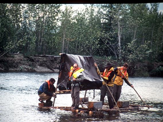 Et c’est partit les 4 sur le radeau le materiel est au sec sous une espèce de tente au milieu, il est très difficile à manoeuvrer car trop large, dans les virages nous prenons beaucoup trop de vitesse.Après plusieurs jours intenses à sortir le radeau enliser,à passer par dessus des arbres versés, l’accident arriva.Dans un virage notre embarcation percute violament un arbre couché, et nous sommes catapulter heureusement nos gilets de sauvetages se gonflent immediatement, pendant ce temps notre radeau coule à pique avec tout le materiel.Mais miracle il ressort un bout plus loin quelque peu endommager. Nous avons perdu notre fusil, seul défense contre un ours et seul moyen de chasser, mais grace au courage de Philippe qui plongea plusieur fois à plus de 5 m dans l’eau glacé, le fusil fût retrouvé.Notre radeau que nous avions baptisé l’aventure est partiellement endommagé, il ne flotte plus nous décidons de l’abandonner.Et s’est à pied que nopus repartons mais le moral en a pris un coup, le piège se referme sur nous nous n’avons aucun moyen de communication aucun signale de détresse et d’ailleurs pour qui, nous sommes à des centaines de km de la civilisation.