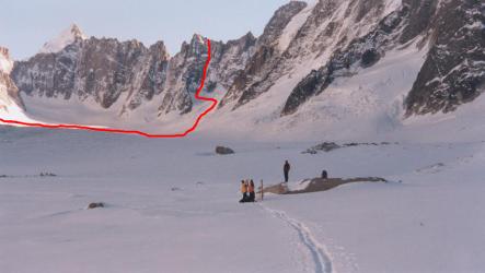 Dans le fond le Petit Viking nous sourit entre le mont Dolent et le Triolet. Mais nous croisons deux anglais qui decendent à skis et qui nous refroidissent un peu. « Petit Viking? That was our destination, but it is too damned cold here for British. »