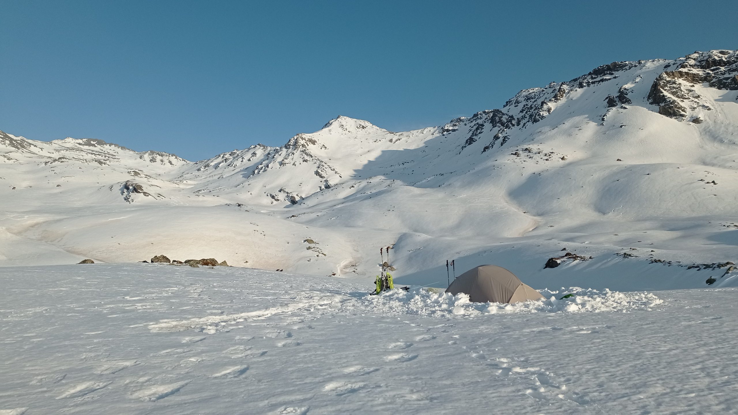 Après une bonne journée d’approche, chargées comme des baudets, nous avons installé notre bivouac et camp de base au bord du lac rond tout enneigé (2450m). Un spot de choix, avec vue incroyable sur les sommets alentours!