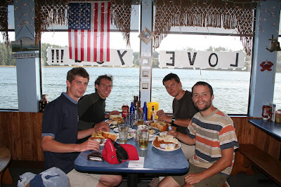 On coutinue a route US-101 South qui longe toute la cote de ‘oregon. Cote assez sauvage et parsemee de ville-resort assez touristique, au look des annees 30. Resto a midi chez Mo’s, qui « support our troops ». On y deguste de succulente huitres crues (servies avec du ketchup), un melange de poisson, huitres et crevettes frits. Pas mal. Le contact passe bien avec la serveuse, une grand mere dynamique qui a surement qqun de sa famillen iraq, au vu de la decoration de son restaurant, et on nous offre a chacun un petit « gift bag » (t-shirt, freesbee, magnet, shot-glass de chez mo’s).