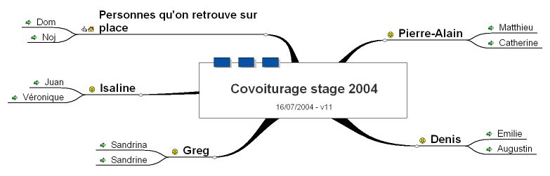 Voici la dernière version du schéma du co-voiturage. J’ai éssayé de mettre minimum 2 chauffeurs par voiture, et de séparer un peu la famille Vanvyve histoire qu’ils ne fassent pas bande à part dès le début … ![]()