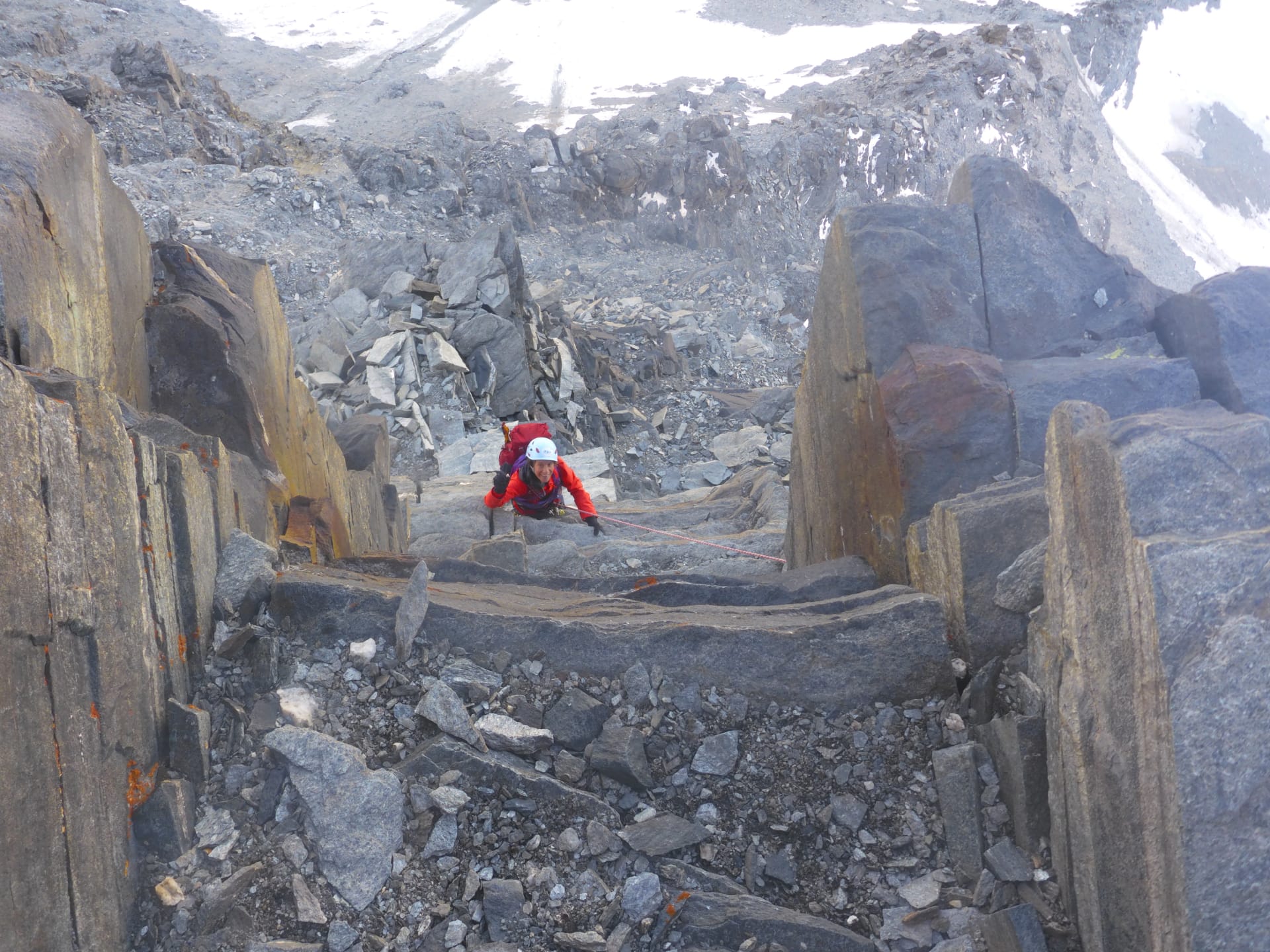 Samedi 3h30 du mat’ : petit déj et préparation des sacs. 4h10, départ avec trois cordées. On est si peu, la montagne sauvage est à nous ! C’est ce qu’on aime ; les lampes frontales dansent dans la nuit, d’abord sur un chemin de randonnée, puis sur les pentes neigeuses, puis sur l’arête rocheuse. Trois ressauts disaient-il dans le topo mais j’en compte au moins six ! Et la brèche, où est-elle dans cet amas de roches qui n’en finit plus ? On continue notre progression et je fais confiance à Jeannot. On ne dit mot mais on est si heureux d’être là, juste à deux, tout roule. Quelle chance inouïe, quelle intensité de vie ! Les heures défilent, les paysages aussi et le voyage intérieur aussi. Tout s’enchaîne, quelle paix intérieure heureuse et partagée. Moments de recherche d’itinéraires, moments de doutes, moments de fatigue, de froid, de vent, de soif… mais cela progresse, on se resserre. Un pas après l’autre ; on y croit. Les heures défilent dans cette immensité, quelle liberté enivrante. Je suis aussi en communion avec Brieuc, mon neveu de 9ans qui se bat jour après jour contre sa tumeur. Une expé, c’est aussi un si long combat intérieur, fait de doutes, de peurs à apprivoiser et à dépasser grâce à la confiance d’y arriver, la présence des autres mais aussi en respectant son propre rythme. Je n’ai pas toujours faim mais je me force à manger les Snickers et les Mars que Jeannot me tend. La tête se fait aussi sentir avec l’altitude mais je continue mes petits pas et j’avance. Parfois je m’arrête et je me dis : « Quelles merveilles, ces couleurs changent à chaque heure ! » et cela me redonne la pêche, la confiance même si ces ressauts rocheux sont interminables !!