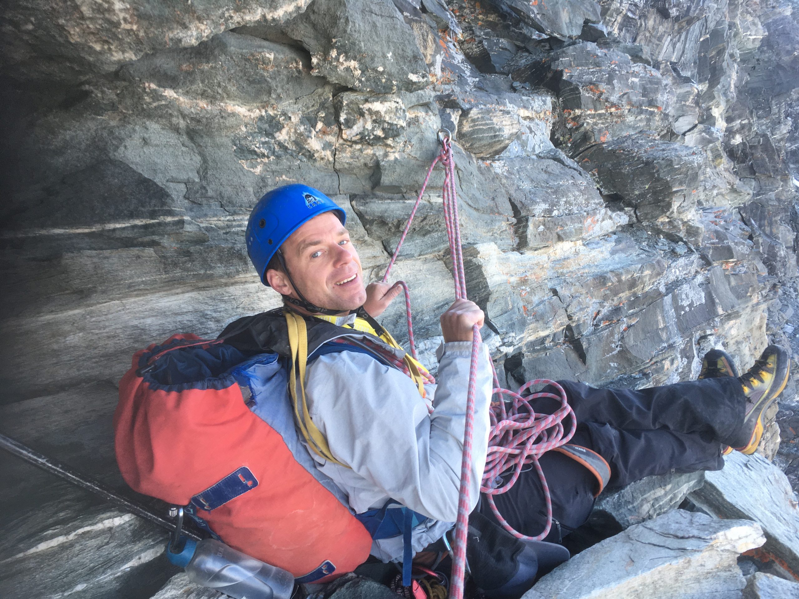Vers 13h30, arrivée euphorique au sommet, Charly veille sur nous du haut de sa croix ! On se sert si fort ! C’est DINGUE ce sommet ! On n’y croyait pas, mais on y est !! On est si fiers. Mais il faut déjà penser à redescendre car nous ne sommes qu’à la moitié, et on arrive à notre horaire limite qu’on s’était fixé pour la descente. On se promet de descendre en toute prudence. On enchaîne les rappels et on retrouve tous les deux une certaine énergie. Le soleil se couche doucement ; on est seul ; on ressort les frontales pour quitter l’arrête rocheuse avant la nuit. Mission accomplie : arrivée au refuge grâce aux kerns qui ont balisé notre fin de course dans la joie et la bonne humeur ! IN-CROY-ABLE, on y est arrivé ! DINGUE. On est au bout de notre vie mais si HEUREUX !