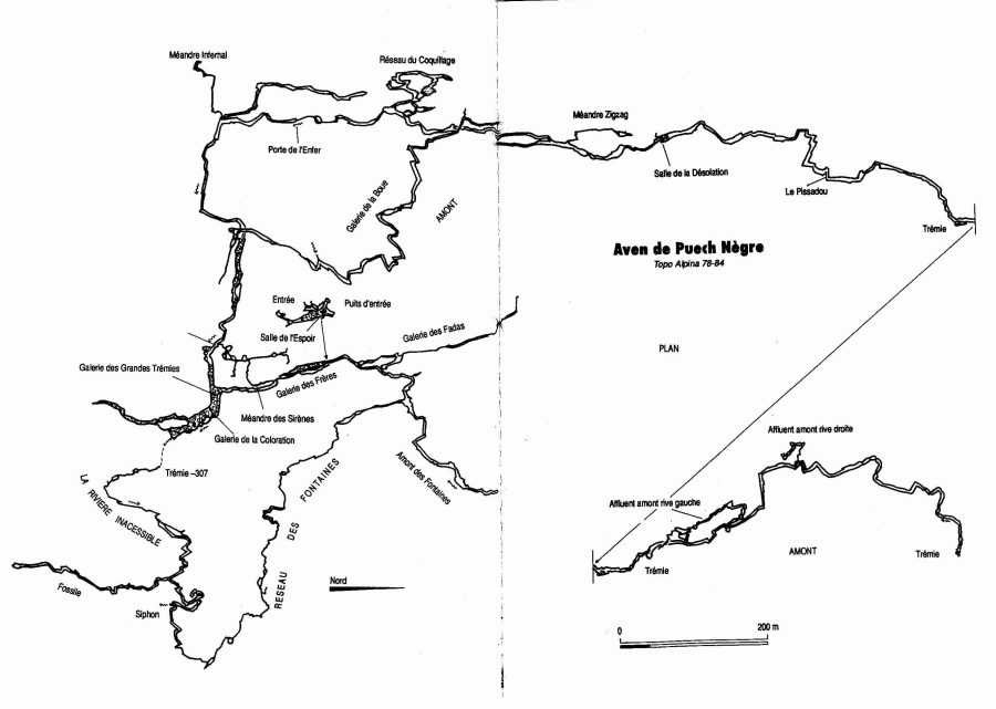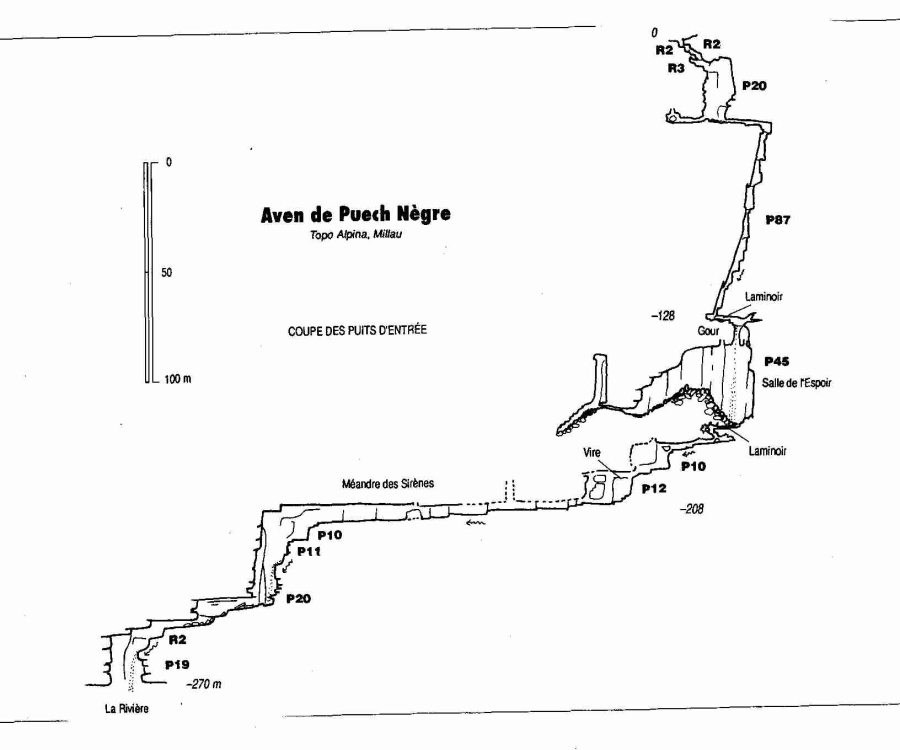 « Découvert en 1978, l’aven de Puech Nègre est devenu la plus profonde cavité des Grands Causses […] Puech Nègre est une superbe classique, qui restera longtemps inégalée, par la beauté de ses puits, de sa rivière et de ses galeries concrétionnées… par la variété des obstacles, qui jalonnent une progression soutenue mais jamais rébarbative… Une exploration, qu’elle ait pour but les puits d’entrée, l’amont ou l’aval, sera toujours remarquable. » (extrait de « spéléo » Septembre-Octobre-Novembre 1990).