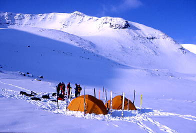 On plante le camp au milieu du plateau, David, Lulu et FX se lancent dans la construction d’un igloo, qui se transforme en pare-vent. Fred et Jonas décident de passer la nuit à la belle étoile. Ils se creusent des cercueils dans la neige, et s’y enfuissent vers 20h. A 10h du soir, ils y sont toujours. Le vent se lève, les nuages s’accumulent. Ils semblent s’accrocher, on (ceux des tentes) craint qu’il ne faille demain reboucher les cerceuils… (A suivre)