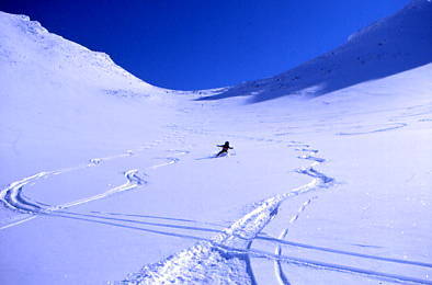 Le mauvais temps se lève, on cuisine dans l’abri. Démontage des tentes assez difficile avec le vent. Malgré David qui roulait les mateles, et les skis, une des tentes failli s’envoler. On démarre en caillant, on ne voit pas grand chose. On doit arriver à un plateau intermédiaire: trop haut, c’est la merde pour redescendre, et trop bas, c’est tout en bas… On avance donc tout doucement, en frolant un ravin, et on arrive à ce petit plateau. La progression est de plus en plus difficile, le vent vient de face, et il grèle. c’est le white-out, on ne distingue presque plus le relief. On décide de redescendre dans la vallée, après avoir vérifié sur la carte qu’il n’y aura pas de surprise dans la descente. On fait partir une petite avalanche. Geoffroy se prend un petit ravin de 2m, on ne voit pas grand chose. On arrive à une cabane, fermée… On redémarre une dernière fois, ça ne glisse plus, même avec de la crème solaire sur les skis. On plante les tentes et mange. FX retourne à la ! ! cabane, il avait oublié son Litherman. On va dormir, en jouant aux cartes. Geoffroy aurait besoin de cours de Wist…(dixit Lulu qui n’aime pas perdre).