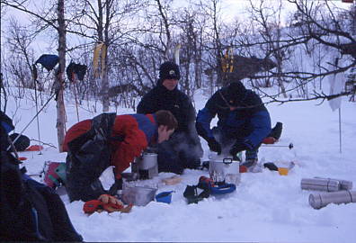 On ne peut plus occuper le refuge, mais FX paye sa place pour faire sècher une tente, et faire le porridge. Préparation des sacs sous la neige, Fred pèse les sacs afin que chacun porte le même poids, tandis que Geoffroy “ n’a pas assez de volume, mais beaucoup de litre ”… Départ vers 12h30, fort dur… assez lent. La neige colle au ski, on soulève des kilos de neige à chaque pas, il neige… bref, c’est HARD.On suit la kungsleden, à travers bois et sur les lacs où des petits arbres sont plantés dans la glace pour indiquer la piste. Après une bonne journée, on arrive dans un petit refuge. Il est 17h30, la gardienne n’est pas très causante ni très accueillante. On plante la tente un peu plus loin. Une bonne petite bouffe (de la soupe au PEMICAN… délicieux et gras à souhaits) et au dodo, après être passés sur des « vrais » djokes. - Vendredi :jour 2: Lever à 8h30, petit déjeuner Crunchy-fruits-des-bois, remplissage des gourdes avec l’eau du lac. (là, c’est pas mal: pour ne pas devoir creuser tous les jours un trou, il y a un trou avec 2 plaques de frigolites et une planche en bois comme isolation.)