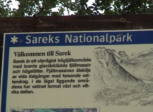 La levée du camp à lieu vers neuf heures et c’est une longue et intense journée de marche qui se présente avec déjà sa première difficulté et non des moindres : les moustiques. La cadence est soutenue et la pluie en fait une marche assez pénible à travers les sapins, les marais et autres petits ruisseaux. C’est devant un panneau annonçant l’entrée dans le Parc National du SAREK que nous déjeunons ennuyés par la pluie. Quoiqu’il en soit la rando continue. Après avoir traversé des torrents glacials où déjà les premières bottines prennent l’eau. Après cette éprouvante journée, on plante les tentes au Parek au pied des premières montagnes. Au menu spaghetti carbonara suivi d’une bonne barre de chocolat côte-d’or. - Cinq août 2005: