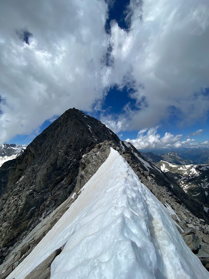 Jour 1. Premier jour, on décide de se mettre en jambe et d’entamer ce périple avec une première rando et surtout les premiers pas d’alpi du séjour. On décide donc à 5 de s’attaquer au grand roc. La première partie est littéralement de la randonnée mais dès les 3000 mètres d’altitude atteint, les premières grosses névés nous obligent à nous équiper. C’est alors les premiers pas plus techniques pour une bonne partie du groupe. Une fois l’arête atteinte nous avons continué jusqu’à atteindre une corniche un peu trop engagée ce qui a donc forcé le groupe à rebrousser chemin. Cette première journée était parfaite pour se mettre dans le bain et prendre ses repères pour la suite du trip.