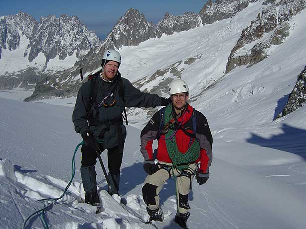 Vous pourrez vous imaginer aisément notre état d’esprit après, pour les uns, une année d’étude forcenée ou bien, pour les autres, de recherche d’équilibre entre vie professionnelle et vie nocturne… Notre plat Pays est bien sympa mais, de temps en temps, aller gratter le ciel dans le massif du Mont-Blanc peut être un moment de délivrance et de renouveau… Ah ! Quel bonheur d’être au cœur d’éléments minéraux, aériens, de dépenses physiques et avec de bons potes … De bons potes? Et bien c’est Christophe B., Kiné parti se rapprocher des montagnes en France, Jonathan M., qui bosse sur les économies d’Energie (Kyoto etc) et Arnaud M., qui bosse dans la bière (vraiment, c’est un job sérieux… hum !!…. Pour certains d’entre nous, c’était même une première… et quelle première ils vous diront !