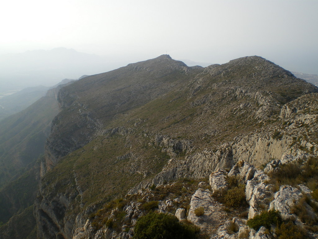 Au pied du Montgó à 17h, et au sommet 1h15 plus tard le long d’un sentier caillouteux, fort désagréable avec des chaussures pareilles, mais bien balisé, j’avais un goût de trop peu, et j’ai dés lors décidé de continuer sur l’arête en me fixant l’objectif d’arriver à la croix que je distinguais deux sommets plus loin, pour profiter un maximum de cette mini-expé. Du sommet, on a une superbe vue sur l’arête du Montgó, sur Javéa, Dénia et leurs alentours, et on est bien placés pour remarquer que la grande majorité des maisons au pied du Montgó sont accompagnées de piscines. La légère brume à l’horizon m’a cependant empêché de distinguer Ibiza à 30km de là.