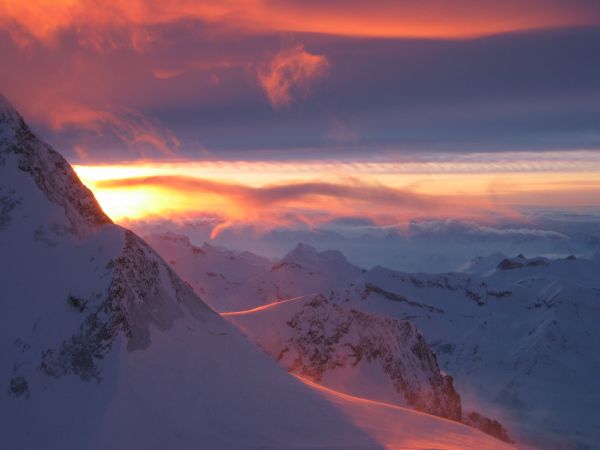 Quelques passages en escalade facile, et une pente en glace plus raide sur la fin nous amène vers13h à l’arête sommitale, le vent triple de force étant donné qu’on se décroche encore plus du décors et qu’on n’est plus à l’abri d’un quelconque obstacle … Les nuages sur la Jungfrau sont menaçant … « merde, putain de temps, Gatien, je crois que c’est bon, on redescend maintenant, tant pis pour les quelques derniers mètres qui mènent au sommet en tant que tel … ». Et on a bien fait de prendre cette décision.