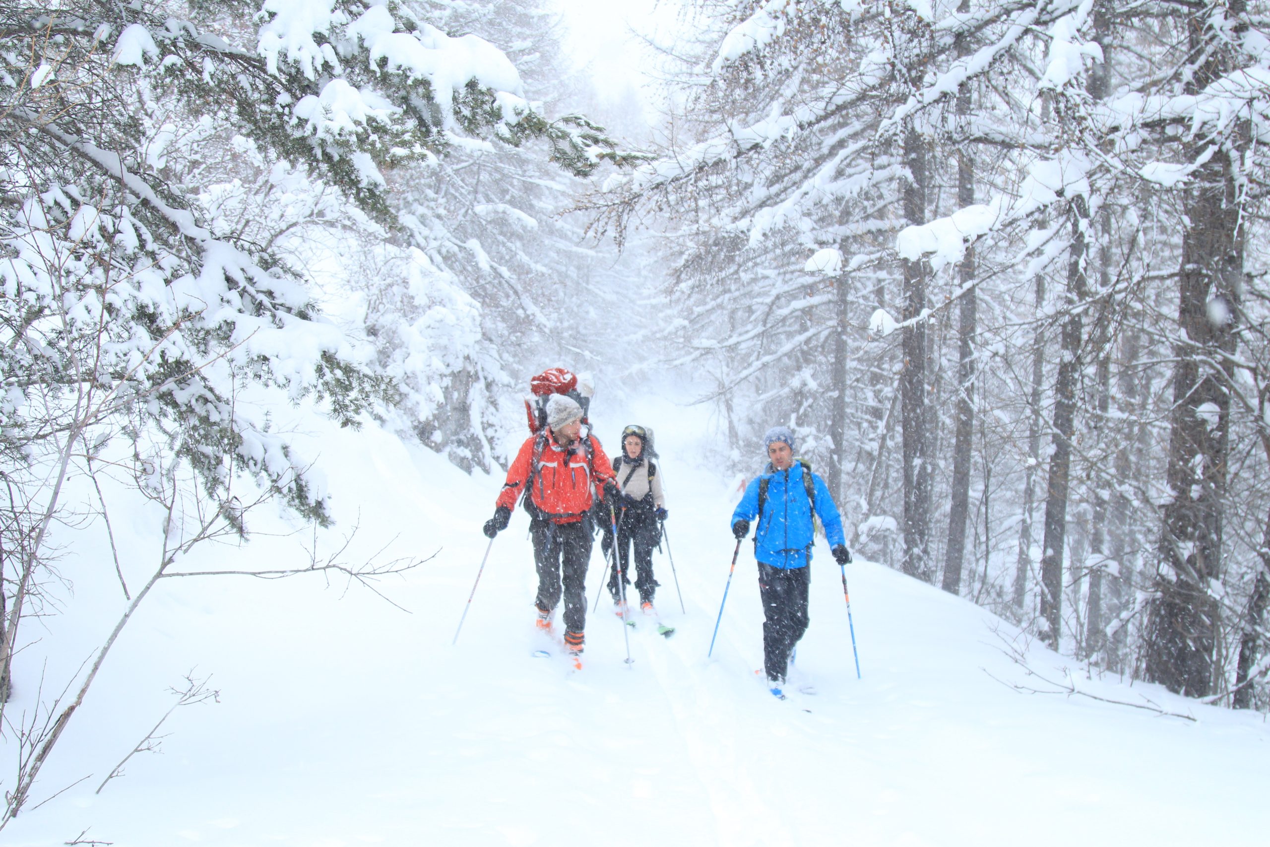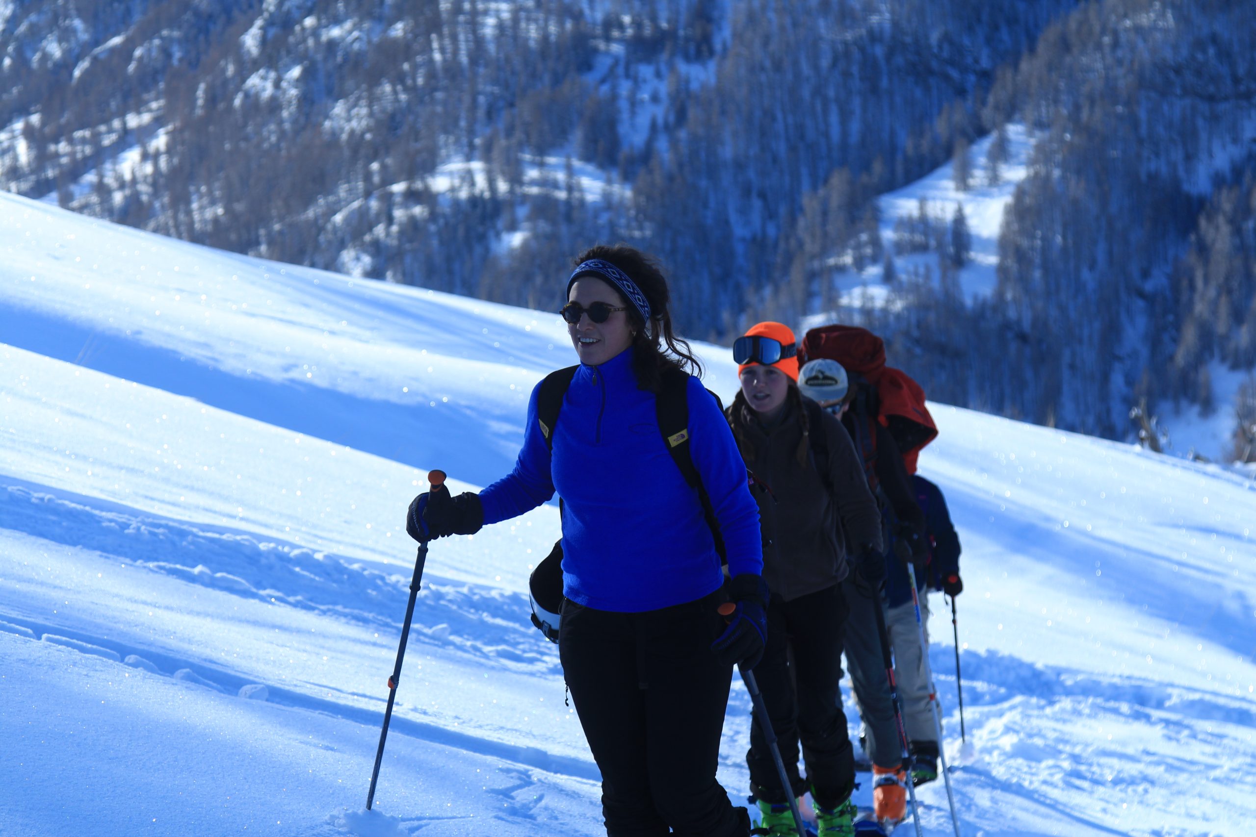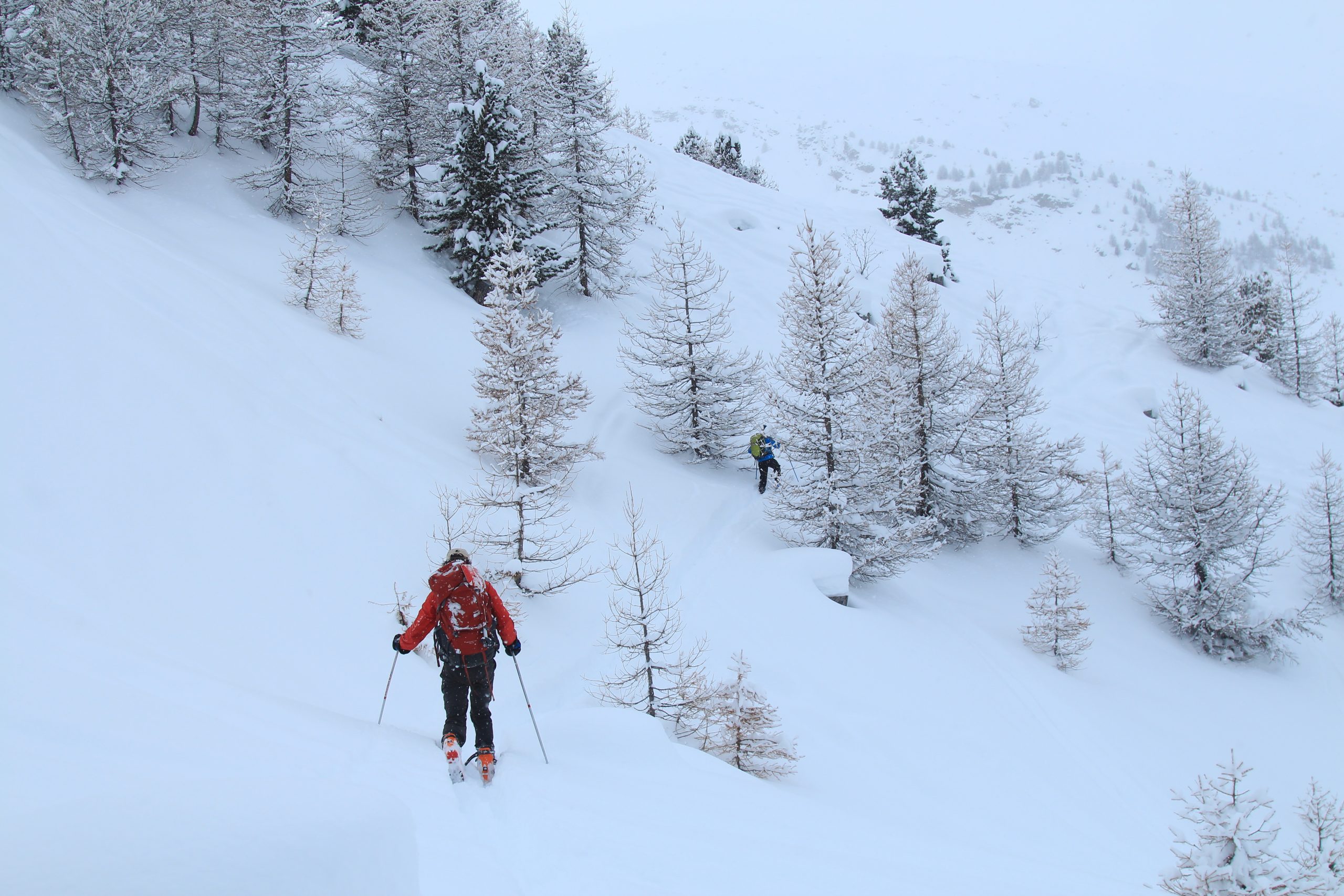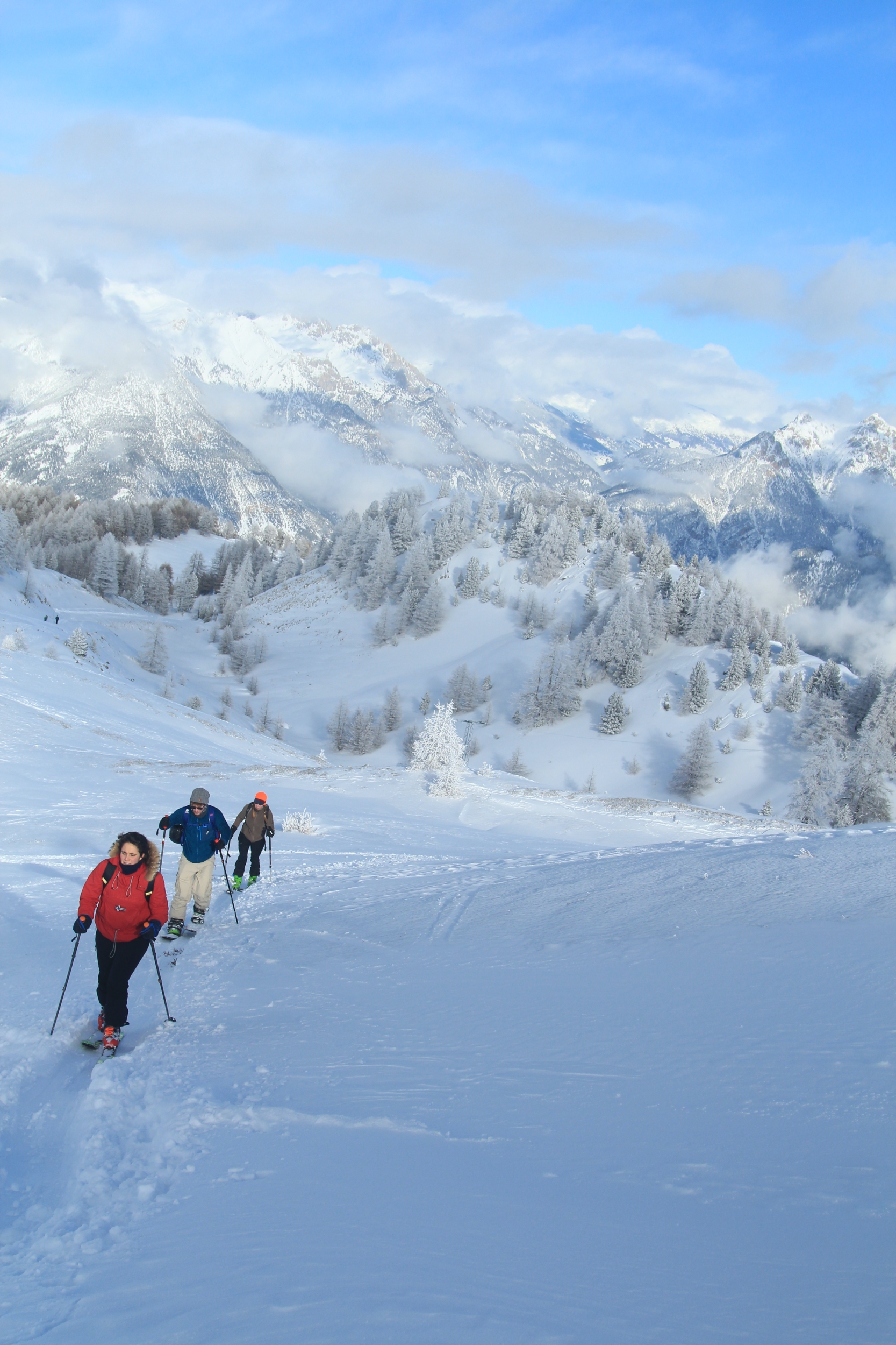 La programme de la semaine pourrait se résumer en deux mots : SKI PLEZIEEER, mais tâchons d’être un peu plus explicites. Tout commença le jour suivant notre arrivée. Une neige immaculée avait recouvert toutes les vallées de la région. Pour éviter de nous faire prendre, retourner et coffrer par des avalanches et afin de surmonter les passages scabreux, nous avons opté pour l’alternative « guide » (malgré les fermes réticences de l’un d’entre nous qui se reconnaîtra honteusement…). Mais attention, nous ne sommes pas tombés sur n’importe quels guides. Nous avons eu la chance de découvrir deux guides aux tempéraments diamétralement opposés qui nous ont tous les deux permis d’arpenter plusieurs versants de montagne avec nos peaux de phoque pour une moyenne d’environ 1200 mètres de dénivelé positif par jour et de redescendre en slalomant les myriades de mélèzes.