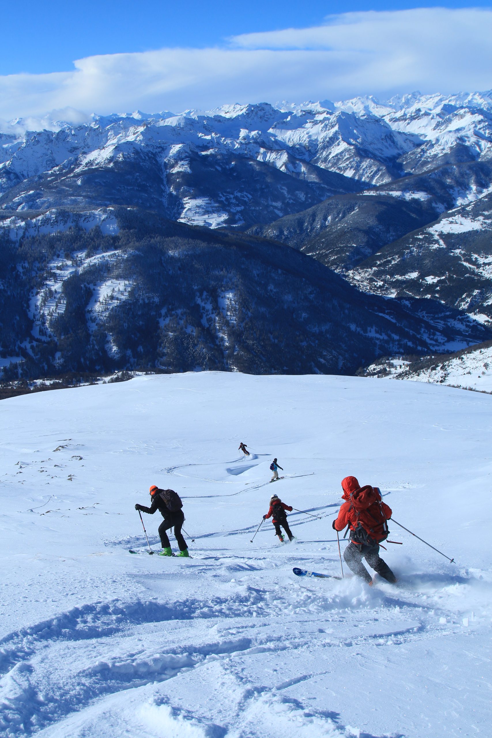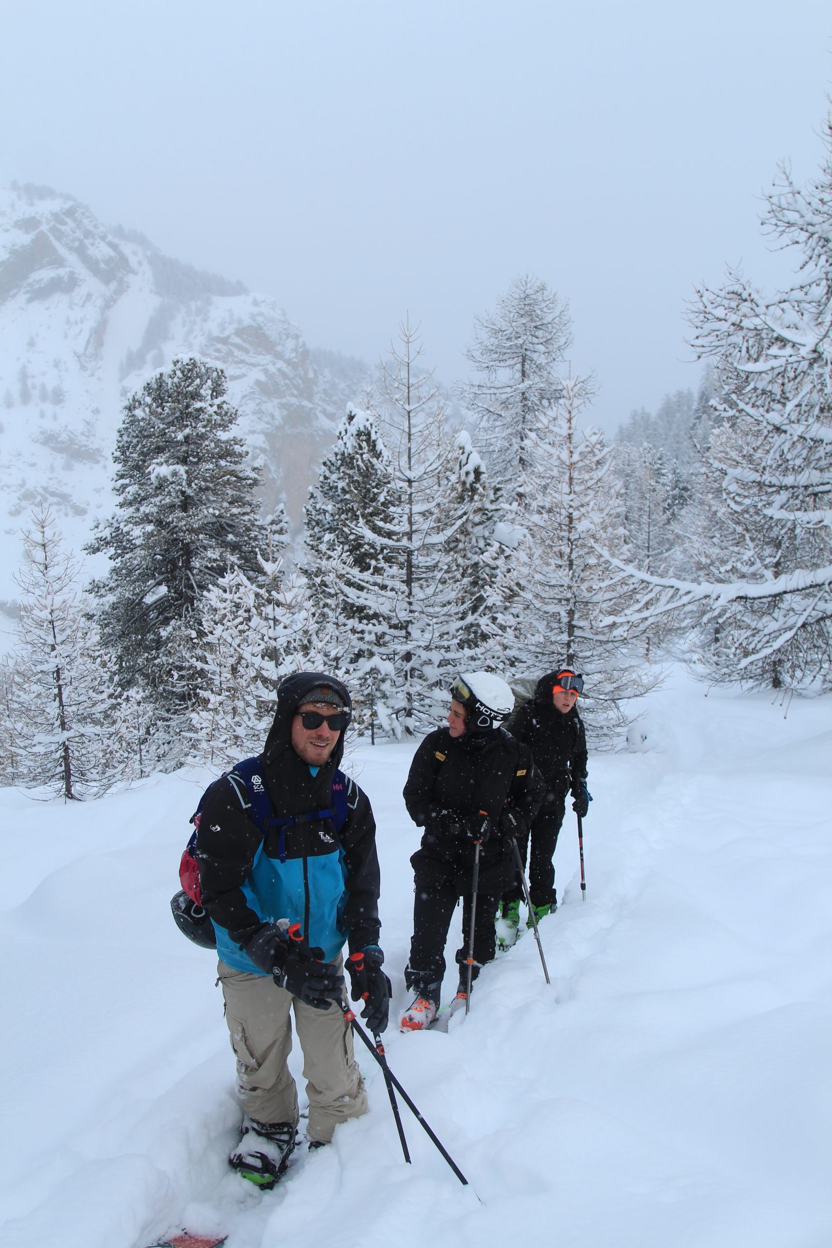 Reynatt, ancien pisteur, expert en nivologie et en formation sauvetage d’avalanche nous a fait découvrir le sentier menant au Belvédère de l’Homme de Pierre du côté de Risoul (le premier jour) ainsi que la crête de la Gardiole dans le massif du Queyras (le second jour). Il nous a partagé beaucoup de ses connaissances dans le domaine du ski de randonnée entre autres concernant les risques d’avalanches (exercices arva-pelle-sonde inclus), des notions de météorologie, de topographie et de composition du manteau neigeux. Nous avons ainsi pu profiter d’itinéraires hors du commun et « rider la puff » en inaugurant des descentes que nous seuls entamions. A cela s’ajoutait le fait que ce cher guide avait de la répartie à toutes nos blagues et connaissait toutes les répliques de Dikkenek par cœur. Bref un bijou expert en psycho-généalogie, une perle rare, du « collector les kids » aurait-il dit.