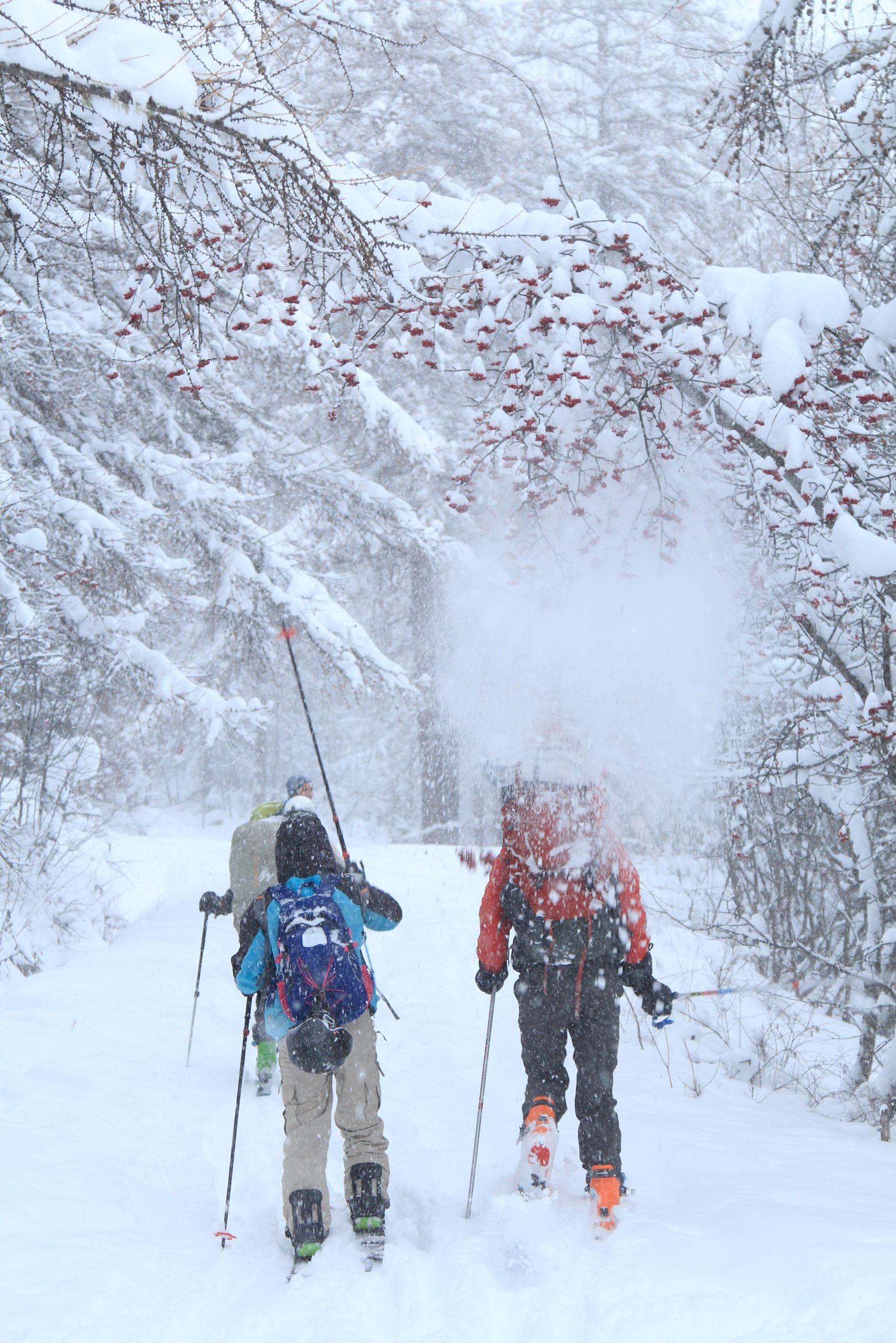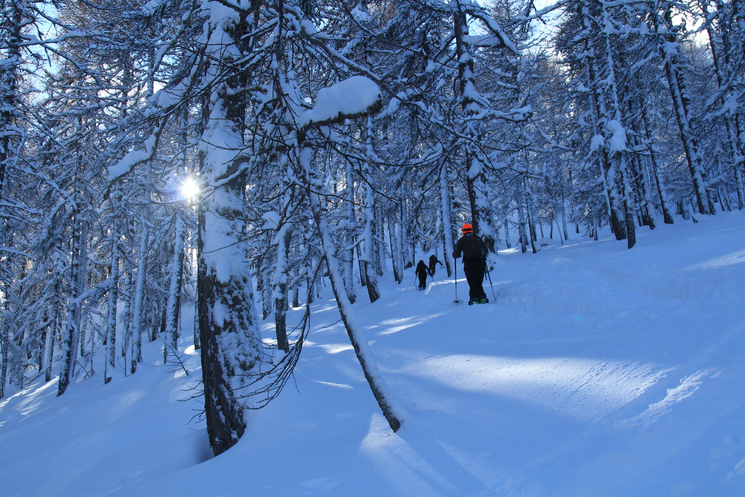 La programme de la semaine pourrait se résumer en deux mots : SKI PLEZIEEER, mais tâchons d’être un peu plus explicites. Tout commença le jour suivant notre arrivée. Une neige immaculée avait recouvert toutes les vallées de la région. Pour éviter de nous faire prendre, retourner et coffrer par des avalanches et afin de surmonter les passages scabreux, nous avons opté pour l’alternative « guide » (malgré les fermes réticences de l’un d’entre nous qui se reconnaîtra honteusement…). Mais attention, nous ne sommes pas tombés sur n’importe quels guides. Nous avons eu la chance de découvrir deux guides aux tempéraments diamétralement opposés qui nous ont tous les deux permis d’arpenter plusieurs versants de montagne avec nos peaux de phoque pour une moyenne d’environ 1200 mètres de dénivelé positif par jour et de redescendre en slalomant les myriades de mélèzes.