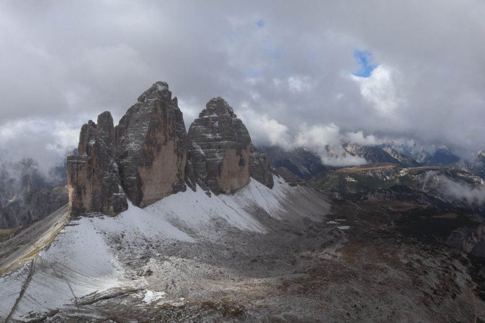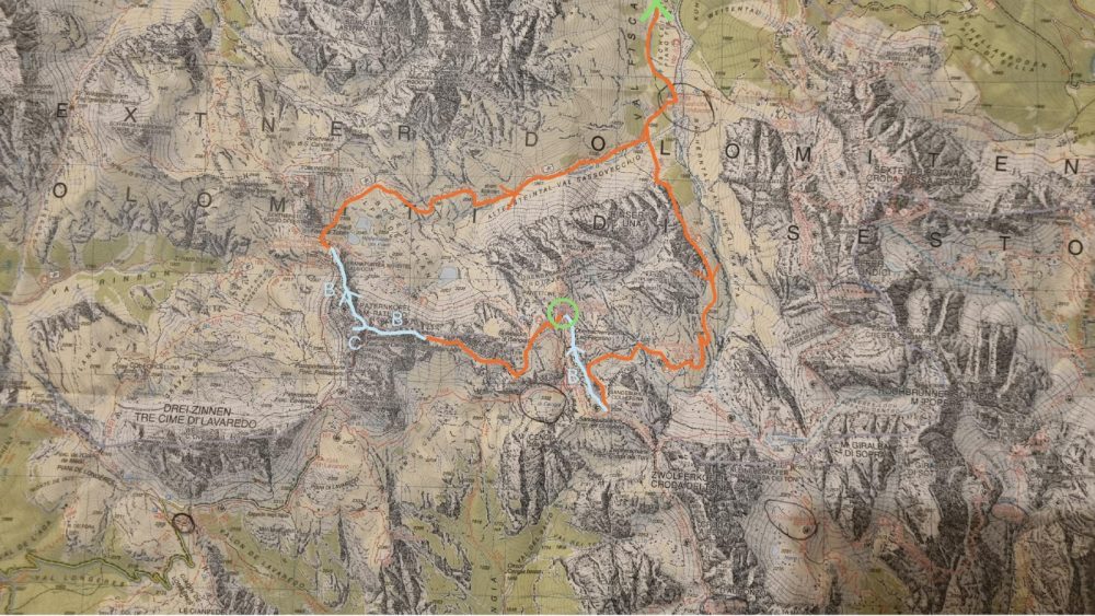Le lendemain : on commence à nouveau par de la marche pour rejoindre la via ferrata du jour (niveau B). Au milieu de la via ferrata, on a la possibilité d’en faire une autre (niveau C) pour atteindre un sommet à 2742 m d’altitude. Au sommet, on a une vue imprenable sur les Tre Cime et les alentours, ça valait la peine !