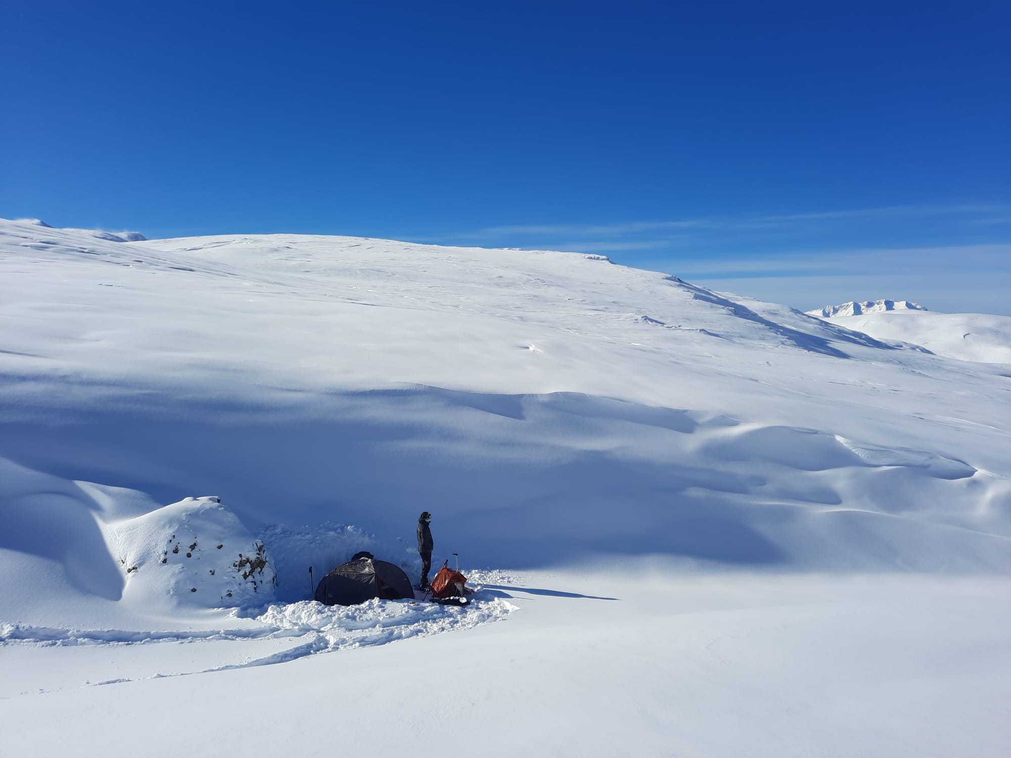 On continue encore à chercher jusqu’à ce que forest trouve un très bon spot à côté d’un gros rocher où l’on sera bien à l’abri du vent. Le même rituel se met en place, on creuse dans la neige, on tasse bien puis on plante la tente. On fait de beaux petits murets autour de la tente pour pas que le vent ne nous gêne.
