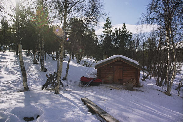 Tout d’abord, il a bien fallu constater que ce n’était pas un refuge, mais un village. Premier bâtiment: mini-superette garnie de tout ce que le randonneur peut avoir besoin: bières, nourriture deshydratée et compeeds. File à la caisse pour réserver un lit. Tandis que l’un des gardiens avait la caisse pour fonction, l’autre faisait l’hôtesse, dirigeant les clients vers leurs chambres respectives… Nous héritions donc d’une chambre-couloir dans le coin d’une cabane emplie de randonneurs affairés. C’est à peine s’il ne fallait pas se battre pour trouver une place assise à table, une casserole et un bec à gaz. Pour le reste du village: deux autres bâtiments-dortoirs, bâtiment toilette, bâtiment sauna…. 45 paires de skis plantés dehors dans la neige, 4 attelages de chiens de traineaux. « You´re on the highway now » nous confirme un skieur suédois.