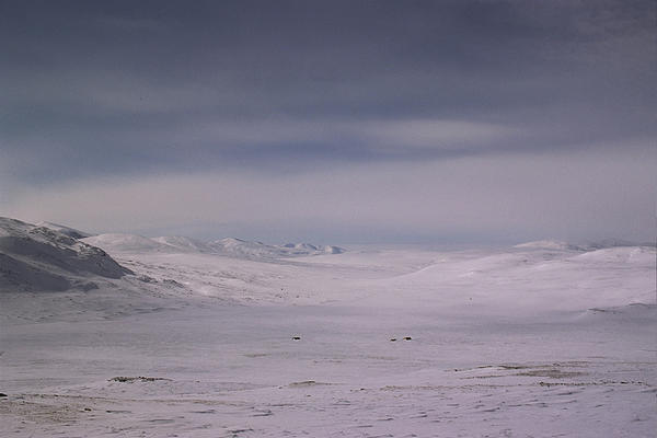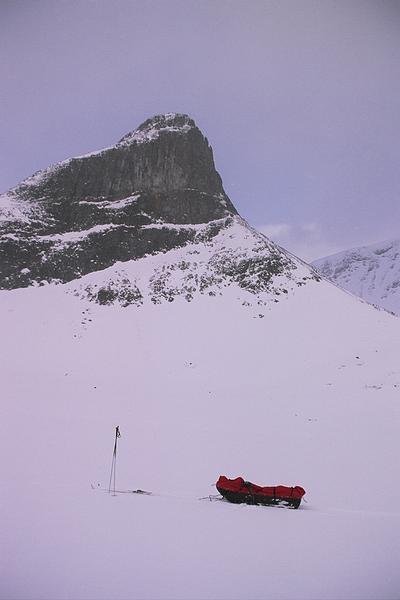 Lundi 17h00, belle amélioration! Le vent tombe, les nuages dégagent la vallée. Les journées sont déjà très longues, autant en profiter! Je quitte donc le refuge, prêt à passer la nuit suivante en tente (la cabane suivante est distante de 20km). La remontée de la vallée Isdalen est magnifique, mais oppressante. La vallée est bordée à la manière d’un fjord d’impressionnantes pentes et parois à pic. La vallée semble se boucher, comme si le fond était occupé par une muraille. Mais où est donc ce col qui semble si évident sur la carte? Je me sens anxieux, je dois me calmer… le temps est ok, les pentes sont douces, la visi est bonne, il n’y a plus de vent. Mais cette lumière déclinante, ces nuages accrochés aux sommets donnent à l’endroit un caractère sinistre. De nombreuses sensations désagréables me reviennent en mémoire, je scrute les pentes. J’ai bien du mal à laisser l’objectivité prendre le dessus. Enfin, je trouve un balisage, je suis les bâtons plantés dans la neige, qui m’indiquent la route. Le cheminement est aisé et sûr. J’arrive au col immensément soulagé.