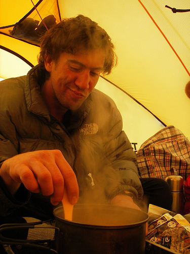 Il ne me faut pas trois heures de marche pour essuyer un brusque changement de temps. Vent, brouillard et chasse-neige, plus de visi. Dans ces conditions, mes résolutions sont claires: monter la tente et ne plus bouger! Je passe finalement l’après-midi, la journée complète du lendemain, et la matinée suivante bloqué sous la tente, aucun changement de temps… soit 45 heures sans mettre un orteil dehors! Dire que je suis à 10km du chalet…