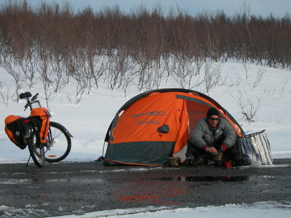 It was around 1 o’clock in the night and I thought of takink a little sleep (can this be called a night, it is nearly as bright as the day…). Pitched the tent in front of a beautiful fjord on the soft lichen, what a dream.