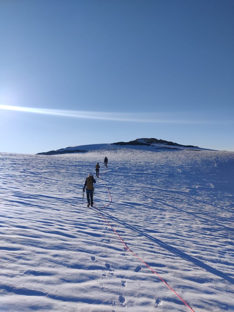 Les conditions sont idéales, il a neigé deux jours plus tôt et il y a eu du regel cette nuit. Le glacier est tout lisse et on ne voit pas l’ombre d’une crevasse.