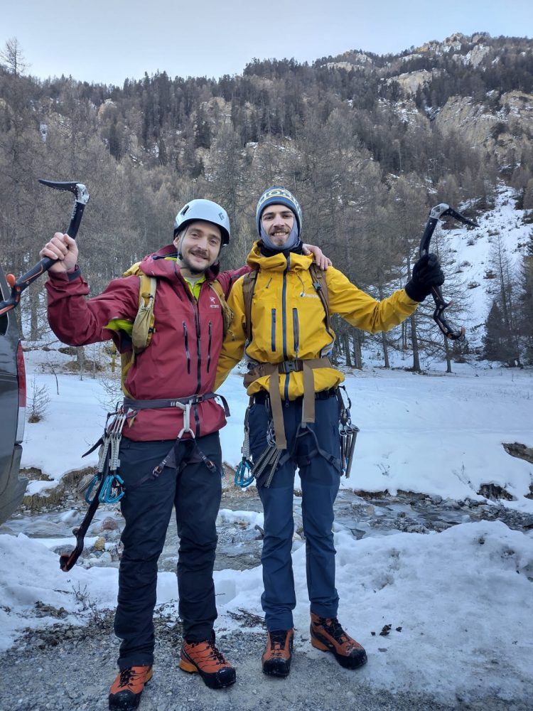 Avant de démarrer en autonomie, on fait une journée de mise en jambe sur les cascade écoles du village d’Aiguilles (Queyras). C’est pour nous l’occasion d’emmener les copains qui voulaient essayer de taper le piolet.