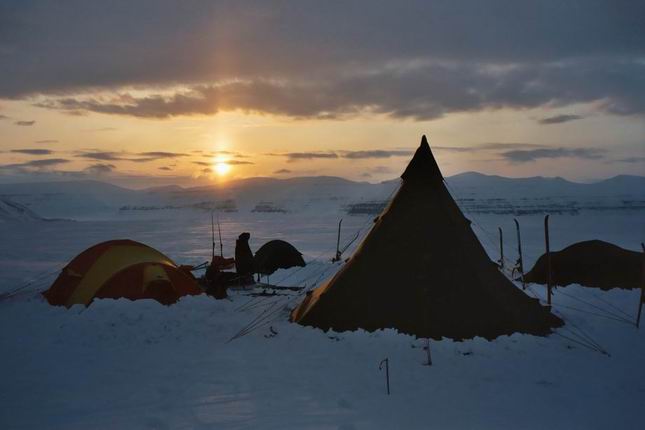 Après une nuit très courte (couchés à 3h30 ce matin) mais confortable, nous nous retrouvons au petit-déjeuner. Un rapide tour de table et la décision est prise : on ne va pas en rester là, nous sommes venus pour l’aventure, cela ne peut être pire que ce que nous avons déjà traversé, donc nous repartons… à l’anglaise. Paul nous retrace un itinéraire en boucle pour une semaine, on déleste un peu nos pulkas, et c’est reparti.Tout l’après-midi nous remontons la Bolterdal. Nous nous aidons les uns les autres pour franchir les dernières pentes qui nous mènent sur un col à 450 m d’altitude où nous installons notre camp. Dépourvus de notre tente mess, nous soupons dehors par – 13 c°. La vue est magnifique. Partie de foot et de pétanque suivie d’une chasse aux œufs dans tout le camp, nous sommes le dimanche de Pâques et ça réchauffe. Photos sous le soleil de minuit et hop dans les sacs pour une nuit sans vent.