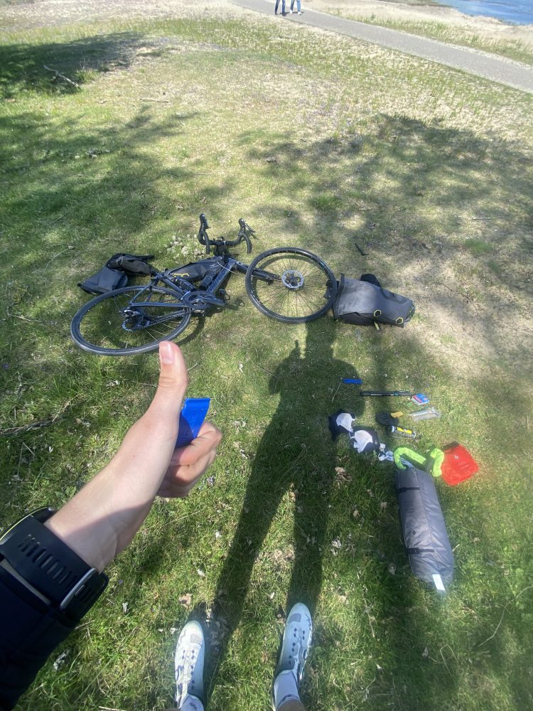 Malheureusement, mon pneu a d’autres projets : crevaison à nouveau, 10 km plus loin. Je tente une dernière réparation, mais voyant l’heure tourner et les kilomètres restants, je décide de changer la chambre à air pour la seule de secours que j’ai. Conscient qu’en cas de nouvelle crevaison, je me retrouverai bloqué en pleine nature.
