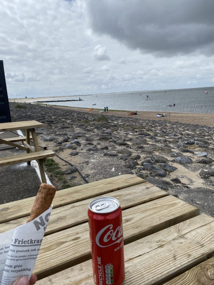 Vers 13h, je fais une pause dans une sorte de golf naturel, où des centaines de personnes s’adonnent au kitesurf. J’en profite pour goûter à la spécialité locale : une fricadelle, accompagnée d’un Coca. Il faut bien garder la ligne…