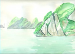 Ce que Baptiste et moi avons rapporté de la baie de Ha Long est un peu différent. J’avais griffonné le texte ci-dessous. Cela lui a plu. Il m’a proposé d’aller un peu plus loin et de lire ce texte lors d’un (petit) festival a Ha Noi, pour accompagner un des morceaux de son concert de violoncelle électrique…