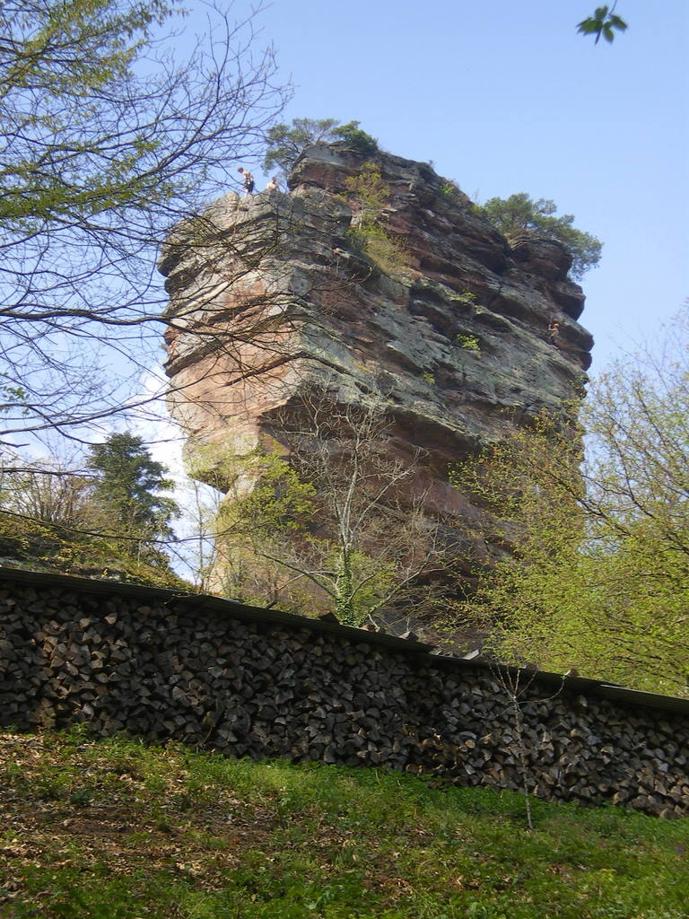 Levés de bonne heure par un dimanche de Pâques ensoleillé, nous reprenons la route vers Niedersteinbach où nous remplissons nos gourdes, puis continuons vers le château de Frœnsbourg où une petit séance photos s’impose, d’autant plus que nous sommes les seuls. Nous continuons vers le château de Fleckenstein, dont l’entrée est payante. Sans payer l’entrée, nous profitons tout de même des tables en dehors de l’enceinte pour le picnic, malgré un bruit insupportable de vidéo en boucle qui vient d’on ne sait où. Nous repartons ensuite vers le château de Lœwenstein qui, de par son altitude, offre un panorama spectaculaire sur l’Allemagne, sur les Vosges du Nord et sur le château de Fleckenstein, mais il est fatalement bondé de touristes et d’escaladeurs. Une petit séance photos s’impose de nouveau.