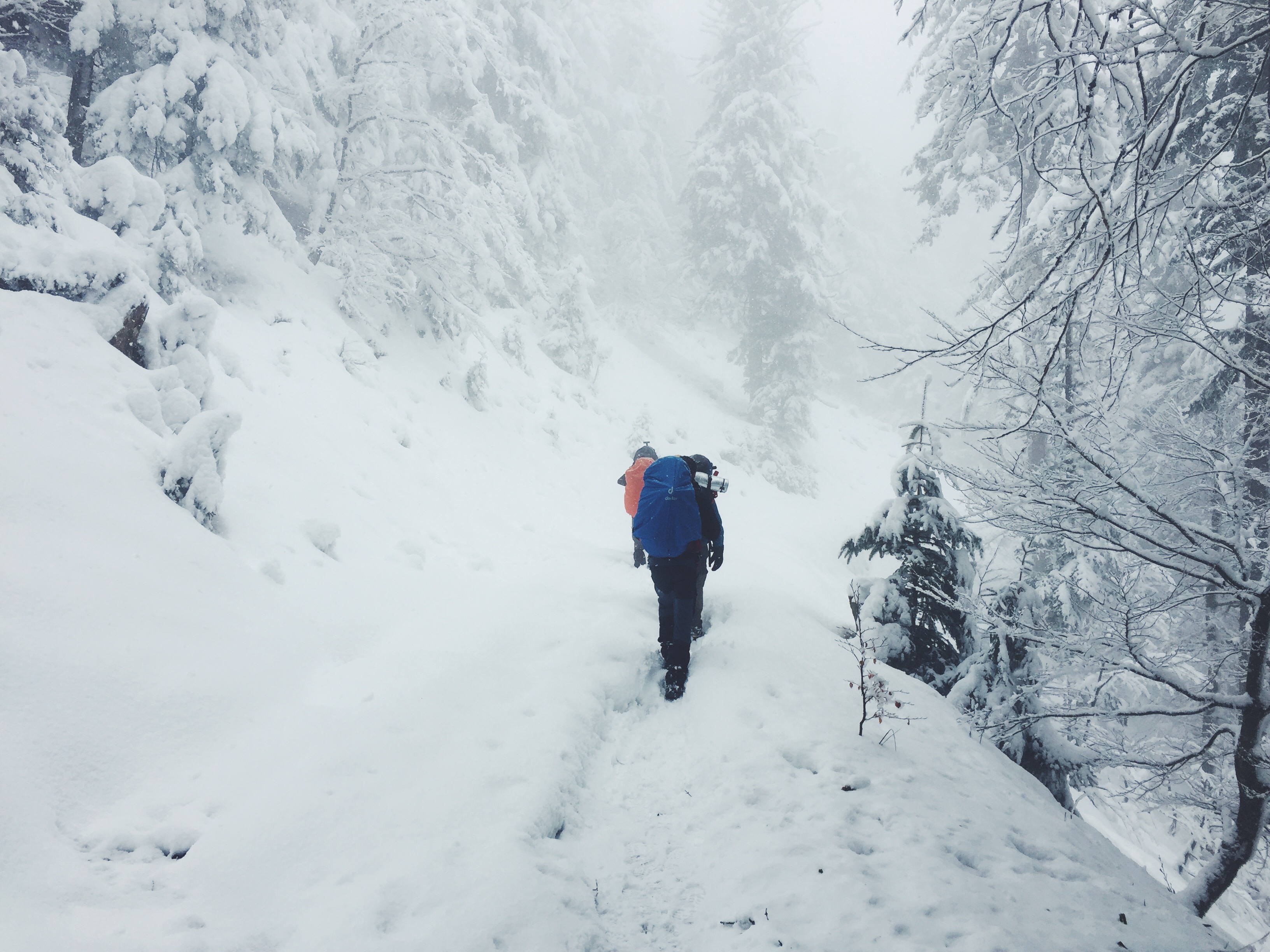 La luminosité extérieure et le bruit de nos chers compagnons de nuitée nous réveilla doucement tandis qu’une nouvelle journée d’aventure s’offrait à nous. Un bon petit déjeuner de porridge était tout se qu’il nous fallait pour remettre en marche nos corps et nos esprits. Une fois le déjeuné avalé et nos paillasses repliées nous étions fin prêt pour marcher. Le blizzard de la veille avait fait place à un ciel légèrement voilé qui laissé présager que le soleil allait bientôt percé. Enjoués de commencer cette belle journée et triste de voir la fin de notre périple se rapprocher, nous avons pris le chemin du retour, celui qui nous fera redécouvrir petit à petit la palette de couleur que nous avions abandonné la veille au profit de cette apaisante blancheur. Un peu perdu au détour d’un tournant, nous en avons profité pour se laisser glisser dans une petite percée qui nous mènera quelques dizaines de mètres plus bas sur un chemin balisé, celui que nous n’avions juste pas trouvé.